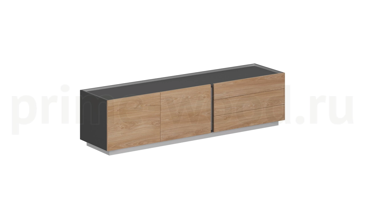 Внутренние боковины, дно, топ, детали ящиков из ЛДСП 18 мм "Оникс серый". Ящики смещены вперёд относительно торцов боковин на 19 мм, боковой проём между ящиками и боковиной закрыт алюминиевой планкой. Этот проем является зоной захвата ящиков для открывания. Направляющие ящиков шариковые полного выдвижения скрытого монтажа (Hettich) с доводчиками. Подиум серого цвета. Высота подиума 60 мм.